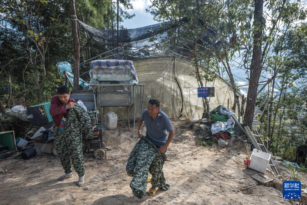 11月19日,在云南省保山市龙陵县龙山镇,黄氏蜂业有限公司工作人员在进入育蜂棚前穿戴防蜂服。
