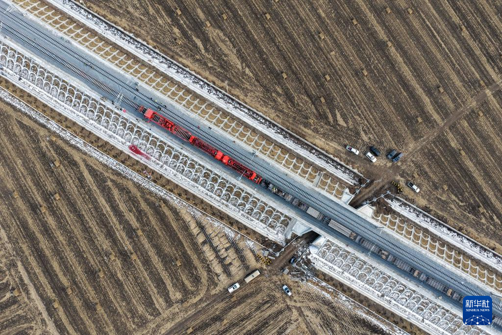 这是11月25日在黑龙江省绥化市庆安县永华村拍摄的哈伊高铁哈铁段铺轨现场(无人机照片)。