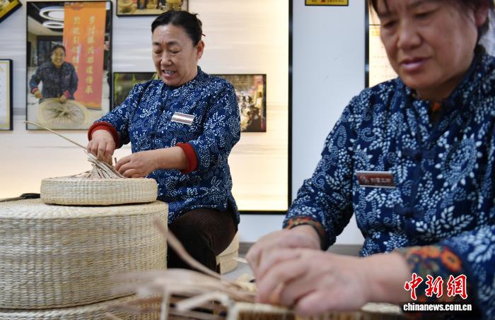 11月26日,河北雄安新区安新县赵北口镇杨庄子村“创富工坊”内,工作人员正在制作蒲草工艺品。中新社记者 韩冰 摄