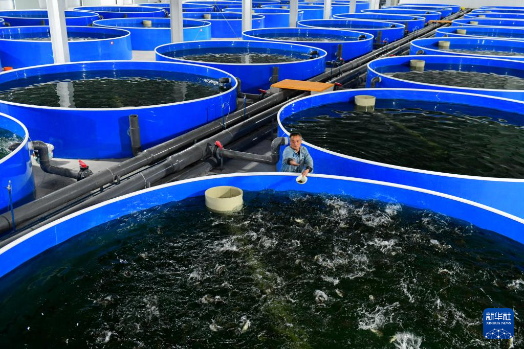 11月27日,在郓城县郓鲁渔业有限公司,工作人员在喂鱼。该养殖场是郓城县丁里长街道利用采煤塌陷区发展的特色养殖业。