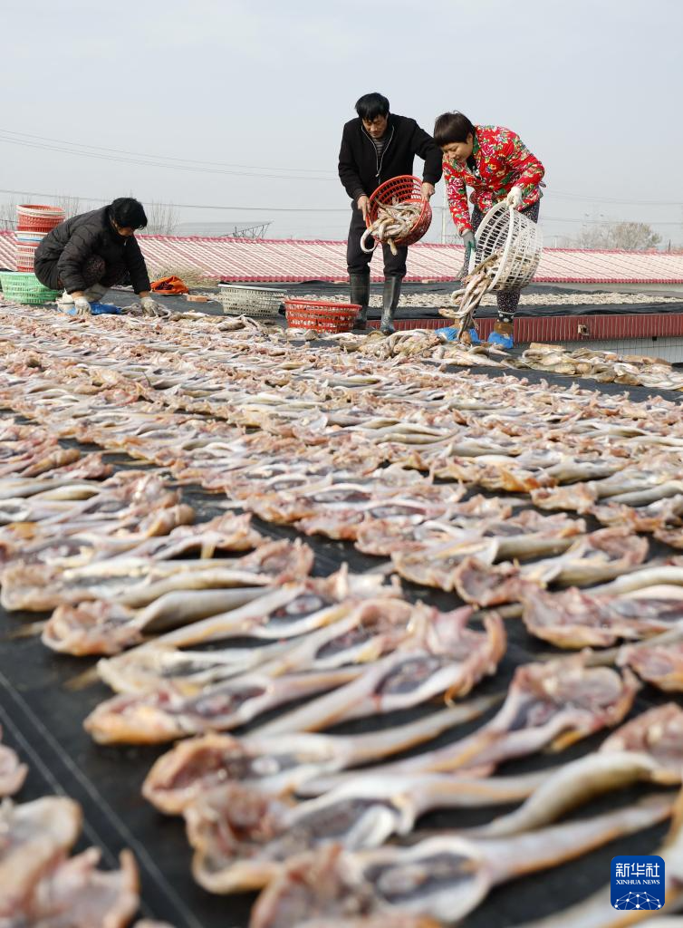 初冬时节,河北省唐山市丰南区黑沿子镇的渔民利用晴好天气,将捕捞的鱼虾等海产品进行加工、晾晒,供应市场。