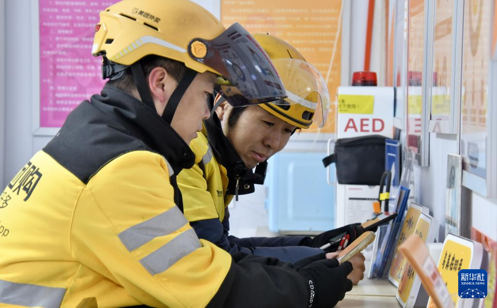 11月26日,几名外卖配送员在东城区崇文门外街道的新世界“暖新驿站”内充电并休息。