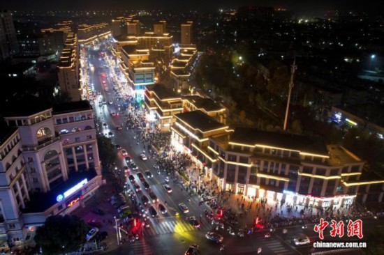 12月1日,航拍广德市绥安路,大量游客排队购买广德“三件套”。(无人机照片) 中新社记者 张强 摄