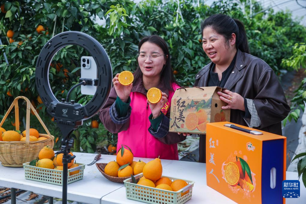 12月4日,在长兴县和平镇东山村四季鲜果家庭农场,当地青年志愿者为农户直播带货红美人柑橘。