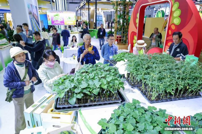 图为展出的蔬菜苗吸引参观者。中新社记者 骆云飞 摄
