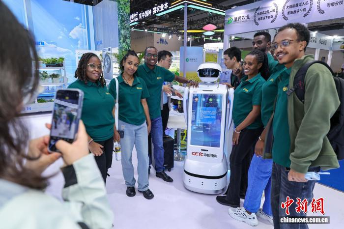 图为冬交会现场的一台机器人吸引外国留学生关注。中新社记者 骆云飞 摄