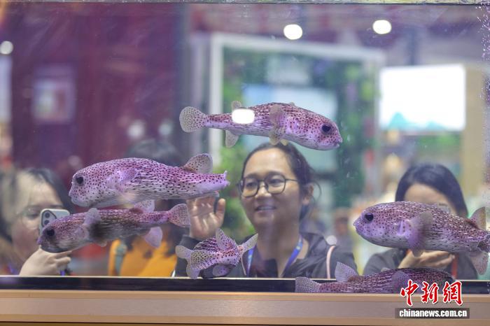 图为展出的气鼓鱼吸引参观者。中新社记者 骆云飞 摄