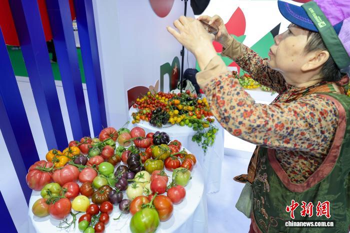 图为展出的多个品种西红柿吸引参观者。中新社记者 骆云飞 摄