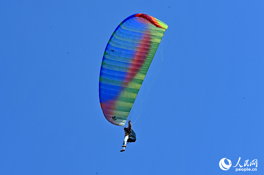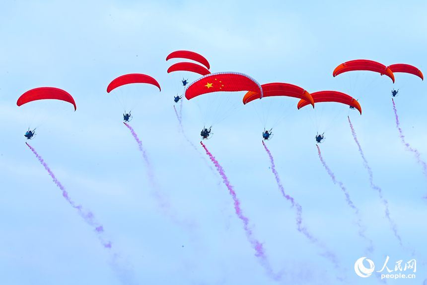 南康区龙回镇布谷寨航空飞行营地,动力伞编队、滑翔伞表演和比赛吸引众多游客前来观看。人民网记者 朱海鹏摄