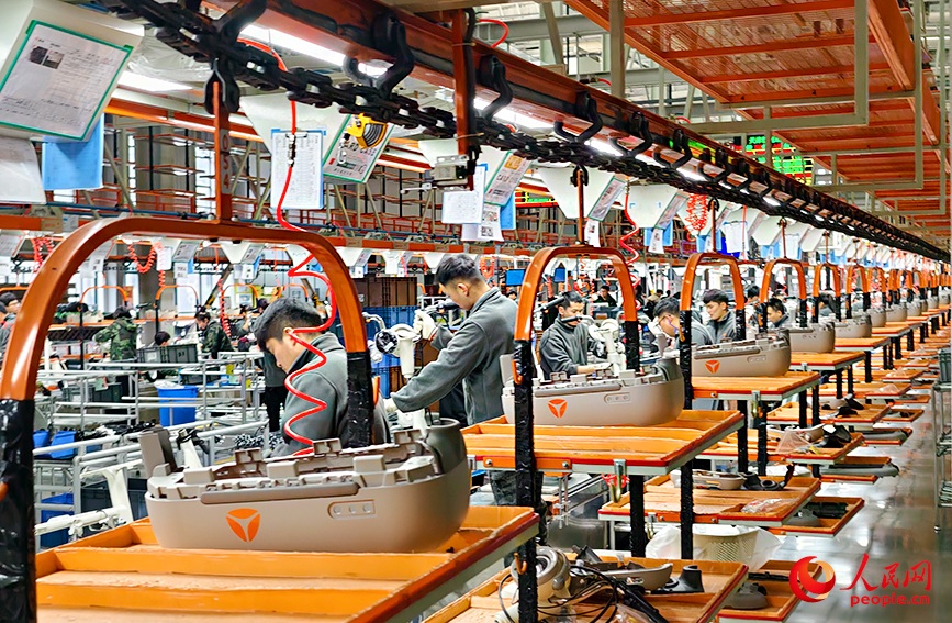 “站立”的电动自行车在总装线上有序移动。人民网记者 郭维瑾摄