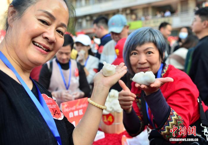 12月7日,“非遗小吃秀 共品沙县味”沙县小吃技艺千人体验活动在福建省三明市沙县区举行,台湾同胞、现场游客以及沙县民众约1000人欢聚一堂,共同体验沙县小吃的饮食文化魅力。沙县小吃历史悠久,共有米、面、豆、肉四大系列240多个品种。图为参加活动的嘉宾在包扁肉。中新社记者 张斌 摄