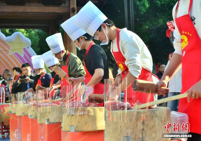 12月7日,“非遗小吃秀 共品沙县味”沙县小吃技艺千人体验活动在福建省三明市沙县区举行,台湾同胞、现场游客以及沙县民众约1000人欢聚一堂,共同体验沙县小吃的饮食文化魅力。沙县小吃历史悠久,共有米、面、豆、肉四大系列240多个品种。图为参加活动的体验者在打扁肉。中新社记者 张斌 摄