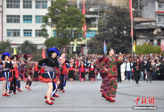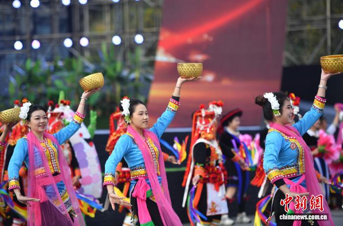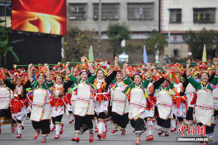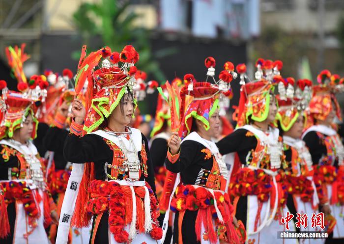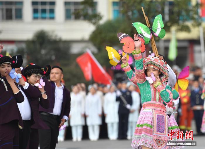 12月7日,各族民众身着节日盛装巡游表演。当日,地处中越边境的云南省红河哈尼族彝族自治州金平苗族瑶族傣族自治县举行成立40周年庆祝大会,各族民众欢聚一堂、载歌载舞,文艺演出、特色产品展销等,让嘉宾、游客领略该县独特魅力,感受“有一种叫云南的生活”。中新社记者 黄兴鸿 摄