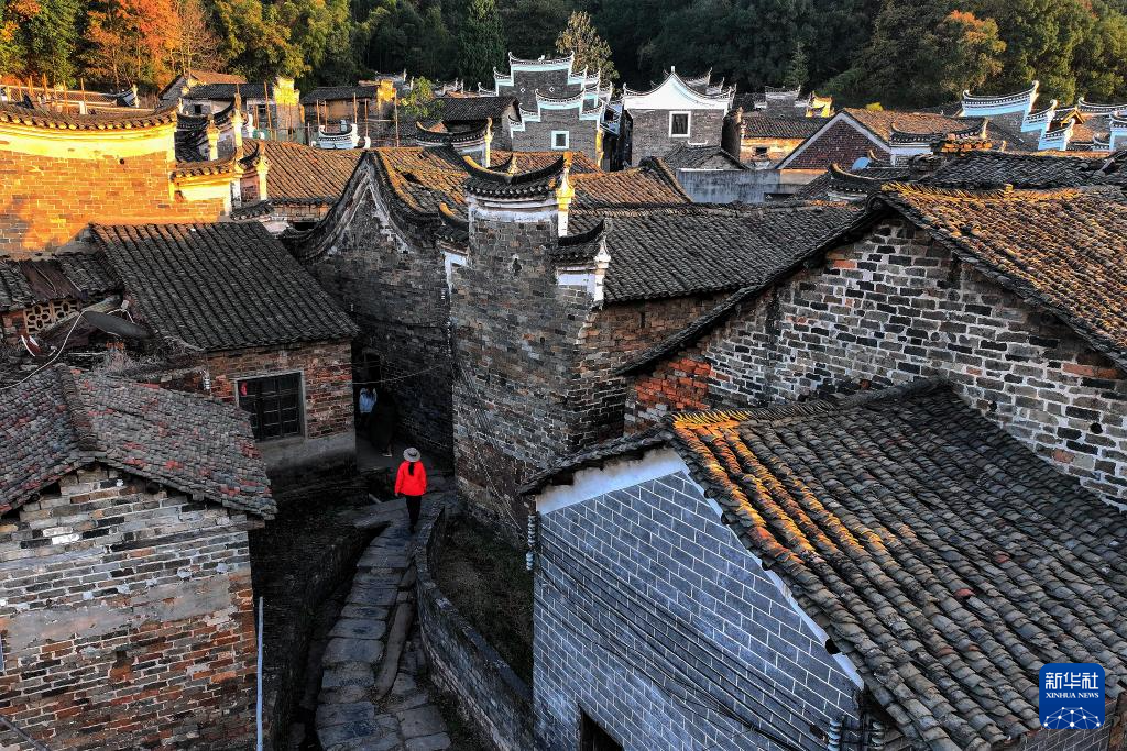 11月26日,游人在郴州永兴县板梁古村参观游览(无人机照片)。
