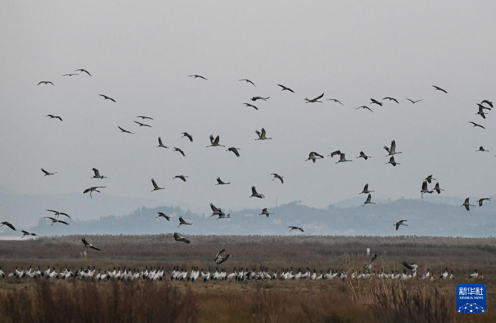 日前,贵州草海国家级自然保护区迎来国家一级保护动物黑颈鹤越冬高峰,加上灰鹤、斑头雁等其他鸟类,呈现万鸟翔集的生态景象。