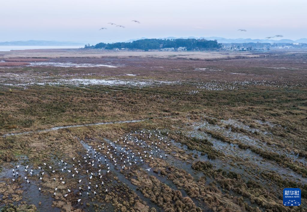 日前,贵州草海国家级自然保护区迎来国家一级保护动物黑颈鹤越冬高峰,加上灰鹤、斑头雁等其他鸟类,呈现万鸟翔集的生态景象。