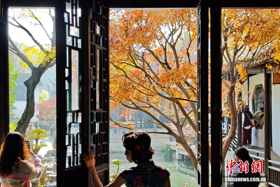 12月7日,江苏无锡,游客在惠山古镇景致中拍摄照片。近日,惠山古镇迎来最美时节,银杏、枫叶、乌桕等绚丽草木色彩与古建筑相映衬,吸引民众前来感受江南古韵。