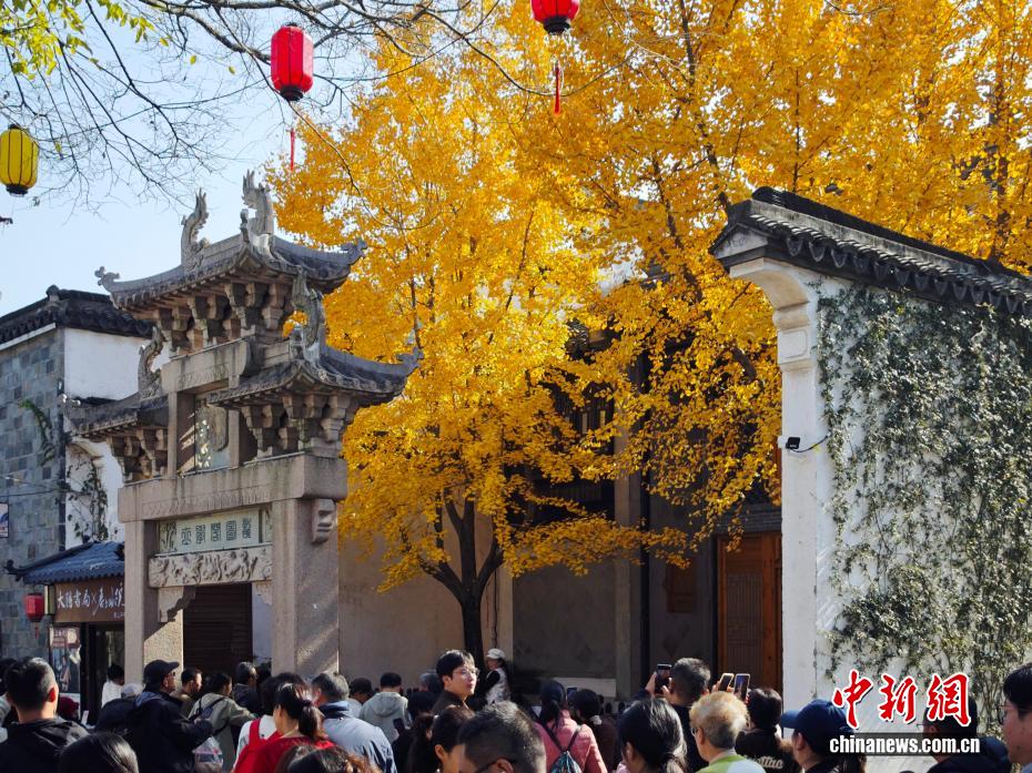 12月7日,江苏无锡,游客们在惠山古镇参观。近日,惠山古镇迎来最美时节,银杏、枫叶、乌桕等绚丽草木色彩与古建筑相映衬,吸引民众前来感受江南古韵。