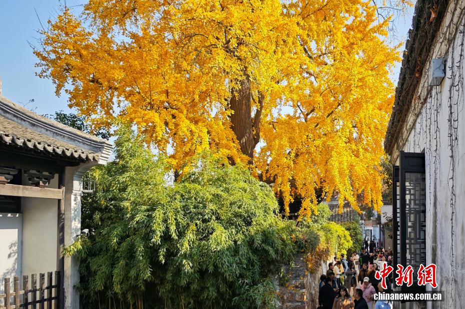 12月7日,江苏无锡,游客在惠山古镇银杏树下参观。近日,惠山古镇迎来最美时节,银杏、枫叶、乌桕等绚丽草木色彩与古建筑相映衬,吸引民众前来感受江南古韵。