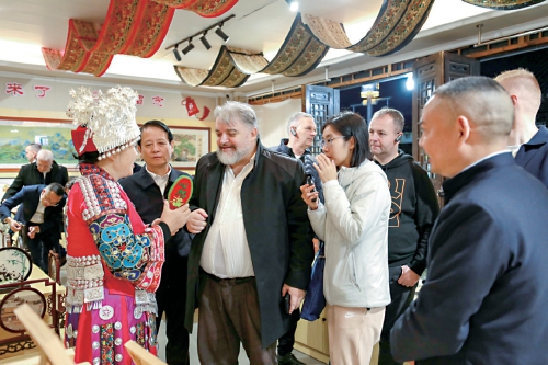 在彭水苗医馆和苗绣馆,考察团沉浸式感受非物质文化遗产的传承活力。彭水作为全国苗族人口聚居最多的区县,31.8万苗族群众守护着苗医苗绣等珍贵文化财富。外宾们了解到彭水正运用自治县立法权推进苗医药发展条例立法,以法治力量护航传统文化传承与产业发展,还亲身体验苗医技能,欣赏桑蚕丝线创作的苗绣书法作品《砥柱铭》,纷纷竖起大拇指点赞。傍晚的蚩尤九黎城之行,让外宾们深切体会到“各民族共赏文化、共话团结”的和谐氛围。