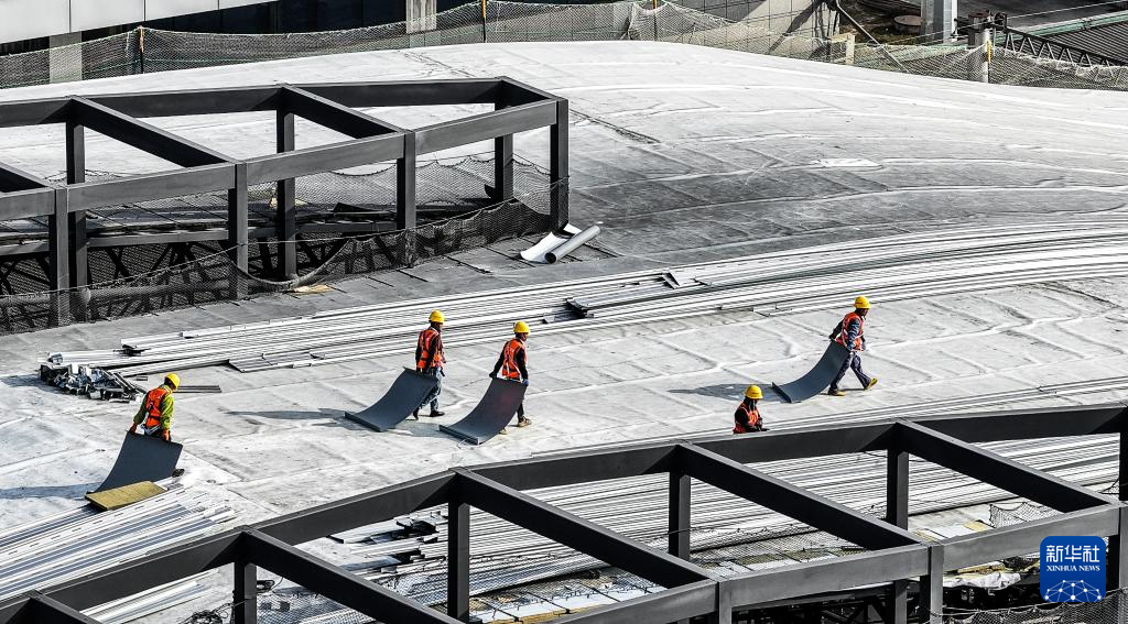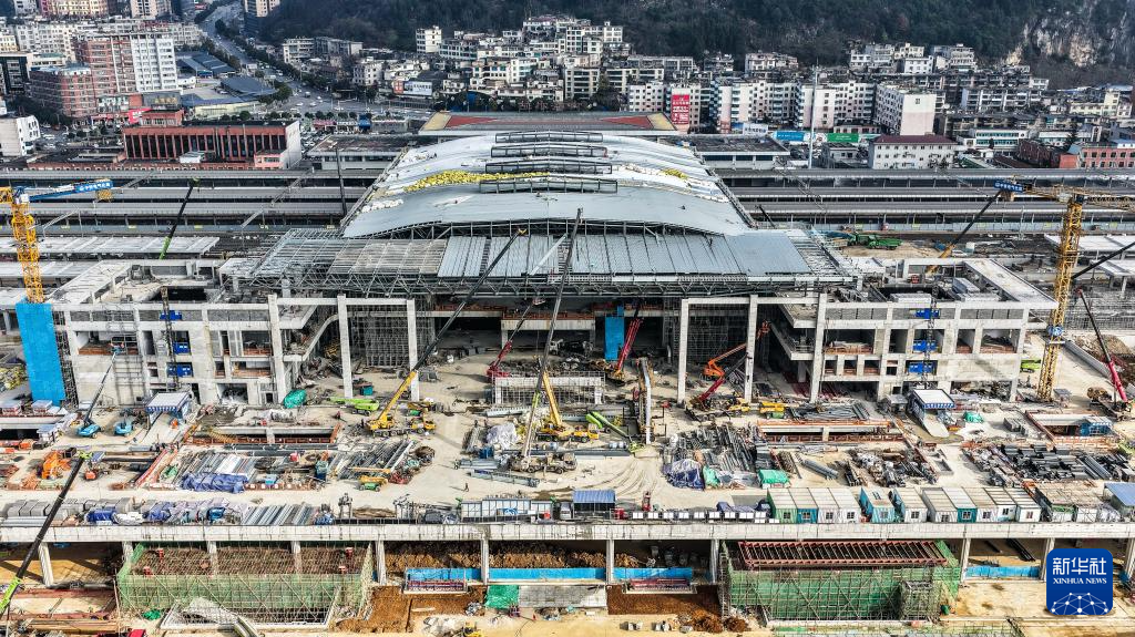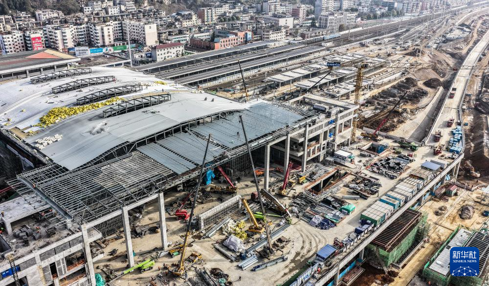 12月11日,工人在六盘水站站房及站场改造工程施工现场施工(无人机照片)。