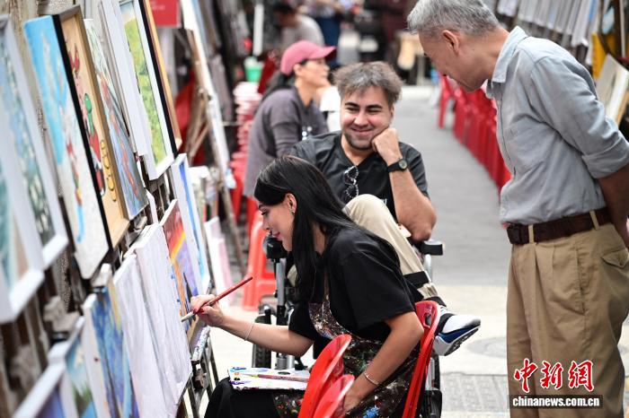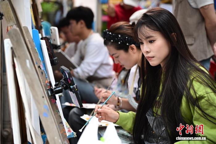 12月11日,游客在大芬油画村体验画油画。大芬油画村位于广东省深圳市龙岗区布吉街道大芬社区,是中国最大的商品油画生产、交易基地之一,有着“中国油画第一村”之称。目前村内共有大小画廊及门店1200余家,村内聚集油画从业人员约8000人。中新社记者 田雨昊 摄
