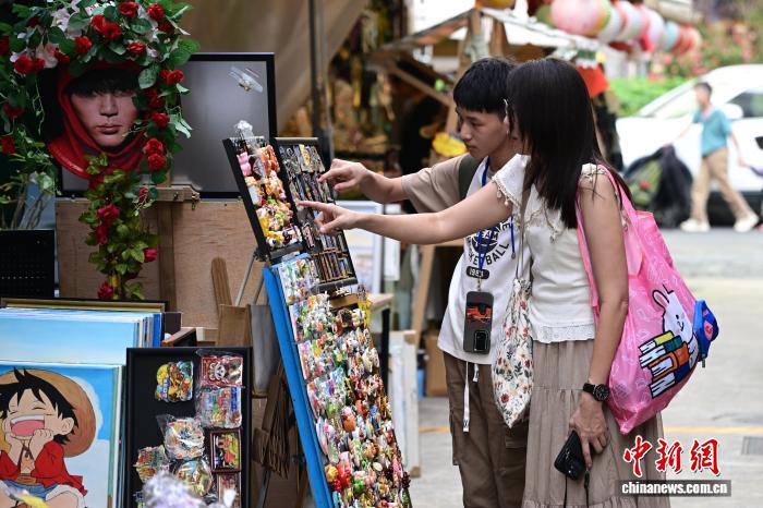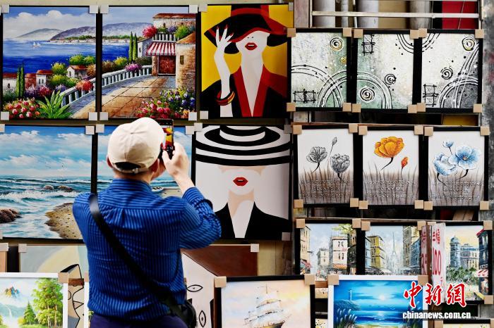 12月11日,游客在大芬油画村选购油画衍生商品。大芬油画村位于广东省深圳市龙岗区布吉街道大芬社区,是中国最大的商品油画生产、交易基地之一,有着“中国油画第一村”之称。目前村内共有大小画廊及门店1200余家,村内聚集油画从业人员约8000人。中新社记者 田雨昊 摄