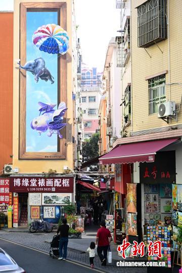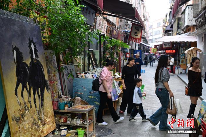 12月11日,游客在大芬油画村游览。大芬油画村位于广东省深圳市龙岗区布吉街道大芬社区,是中国最大的商品油画生产、交易基地之一,有着“中国油画第一村”之称。目前村内共有大小画廊及门店1200余家,村内聚集油画从业人员约8000人。中新社记者 田雨昊 摄