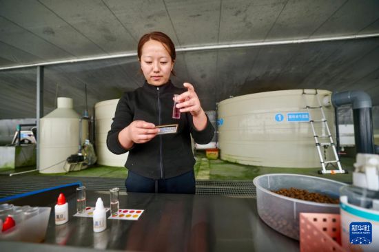 12月12日,在位于宁夏贺兰县的蓝湾生态农业有限公司渔业设施温棚内,工作人员检测水质。