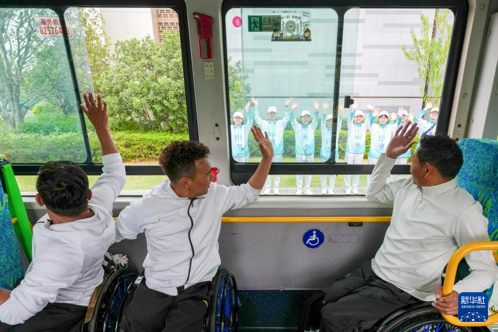 12月12日,西藏轮椅篮球队球员次旺仁增(左)、加央江村(中)、旦增赤列在无障碍巴士上向志愿者挥手。