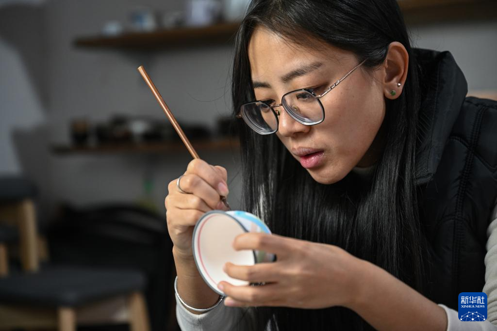 12月16日,马静文在工作室给瓷器描绘图案。