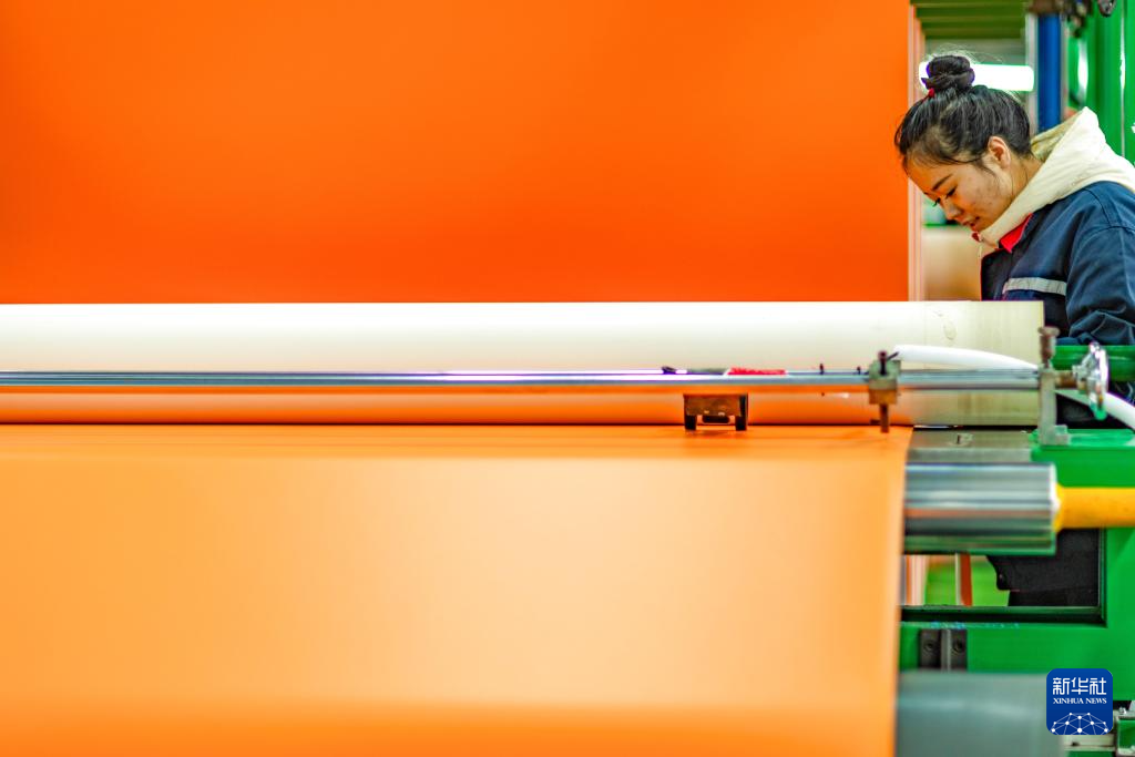 12月12日,工人在四川省广元市一家卷材地板制造车间的生产线上工作。