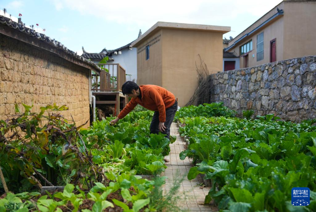 12月20日,来自四川的旅居客赵发英在曼海村查看自己种的蔬菜。