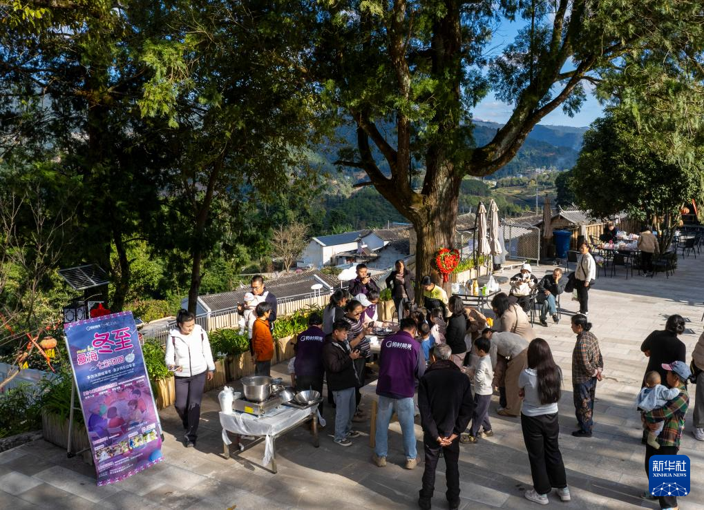 12月20日,游客在曼海村村广场体验冬至做汤圆活动。