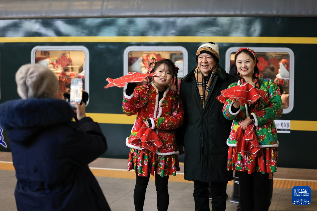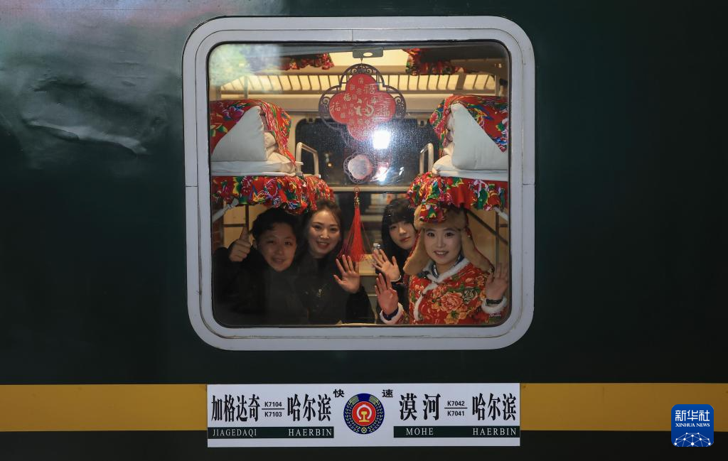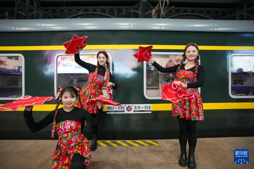 12月22日,K7041次旅客列车从哈尔滨站驶出,开往漠河。这是中国铁路哈尔滨局集团有限公司今冬开行的首趟东北民俗文化主题列车,旅客可在旅程中感受东北地域文化的温度与“热闹劲儿”。