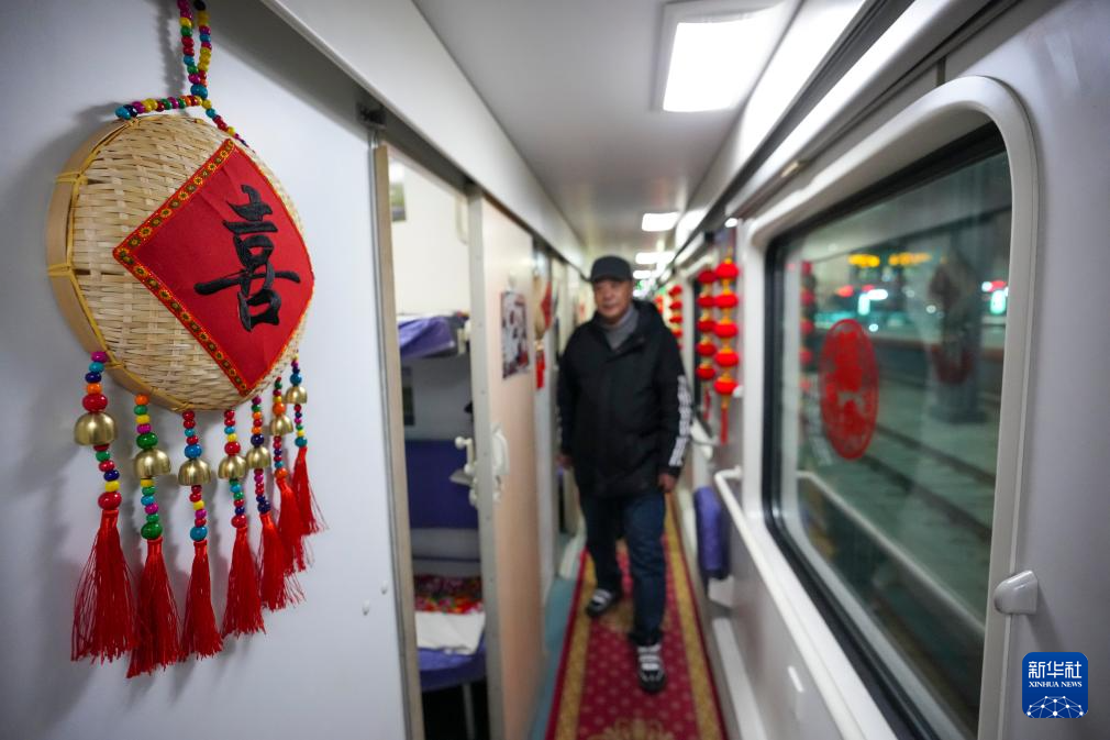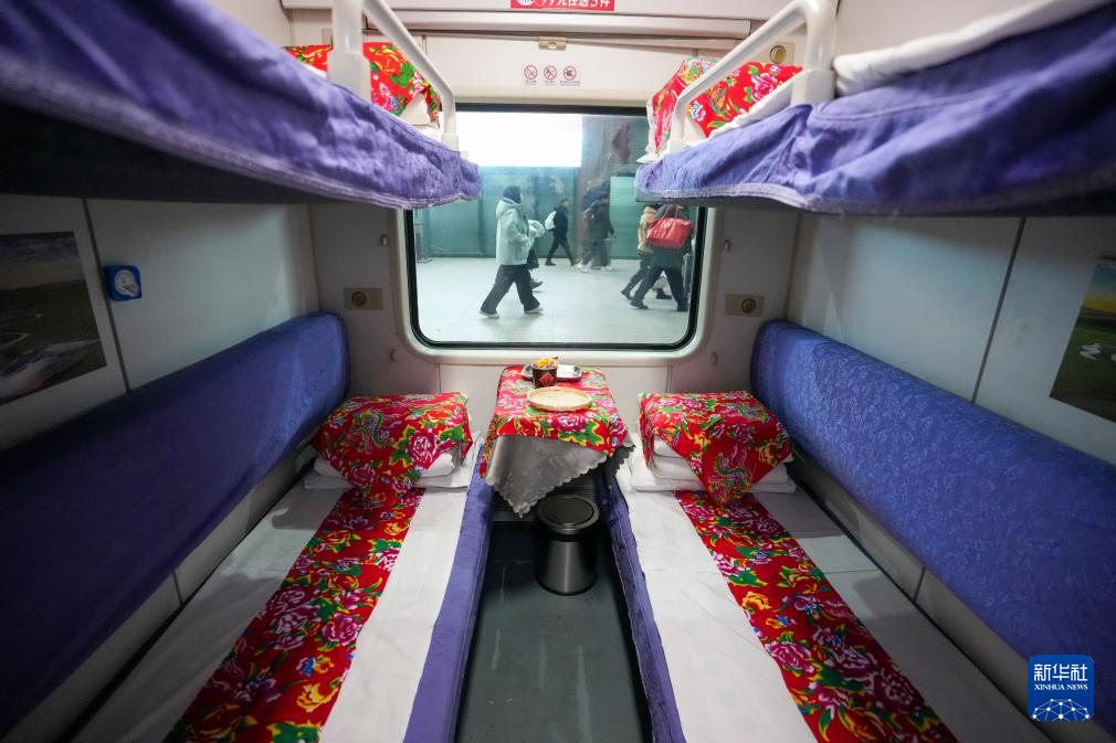 12月22日,旅客进入K7041次列车东北风情主题卧铺车厢。