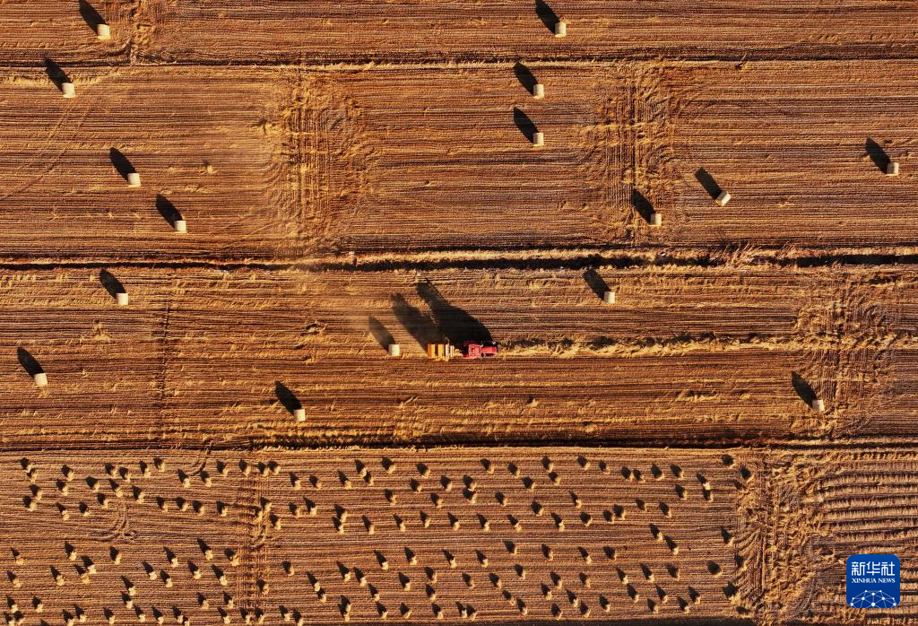 12月27日,农机手驾驶农机在唐山市丰南区西葛镇的田间将水稻秸秆打包回收(无人机照片)。