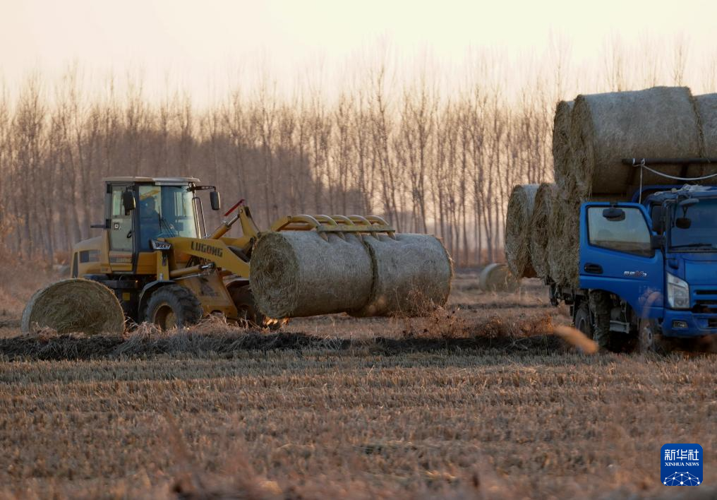 12月27日,稻草回收企业的工人在唐山市丰南区西葛镇的田间将打包好的水稻秸秆装车转运。
