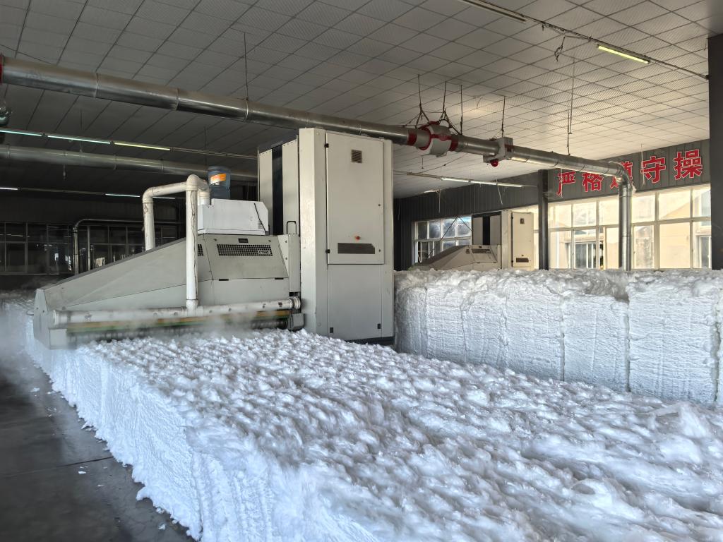 在生产车间,往复式抓棉机正在“吞吐”物料。新华社记者 田中全 摄