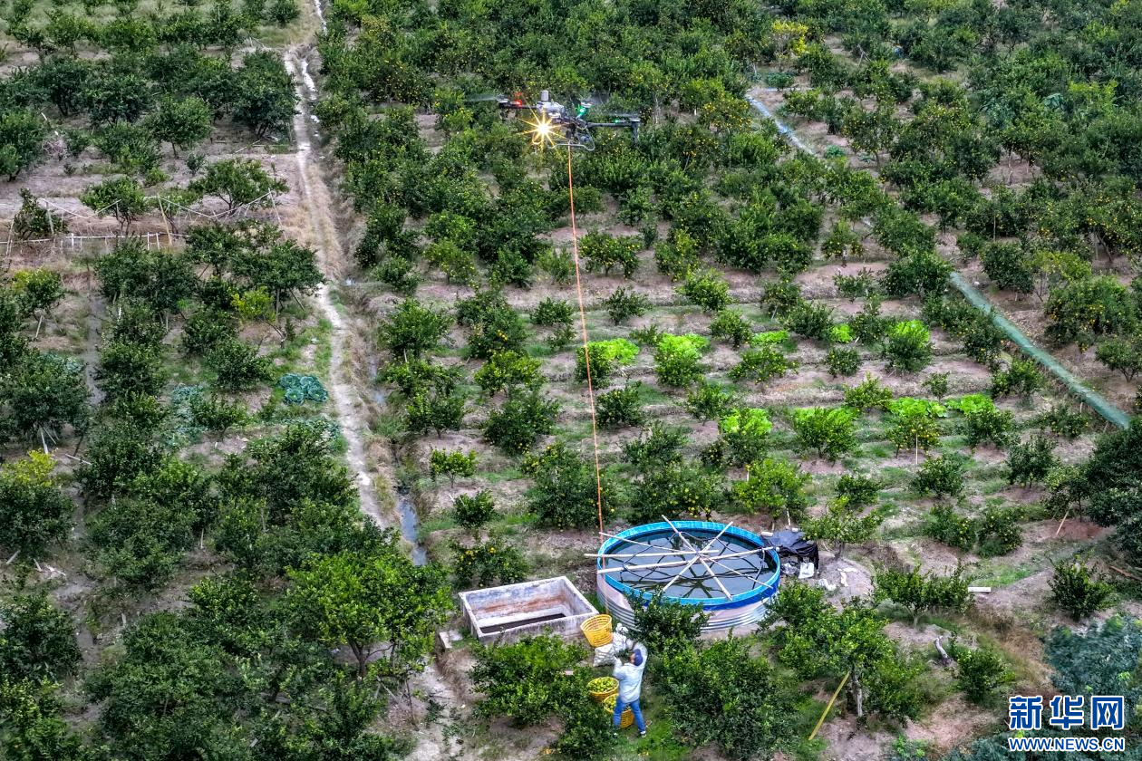 2025年11月17日,浙江省温州市瓯海区一片瓯柑园里省力、高效的无人机运输。新华网发 陈明铭摄