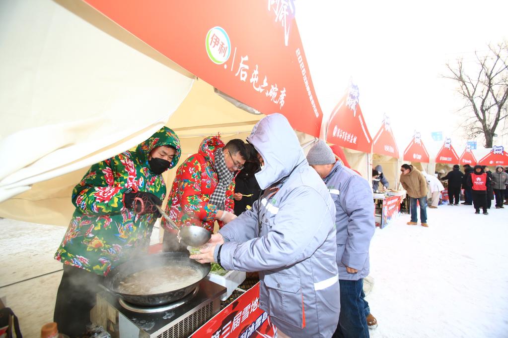 这是雪地足球“村超”联赛启动仪式现场,市集上的东北菜