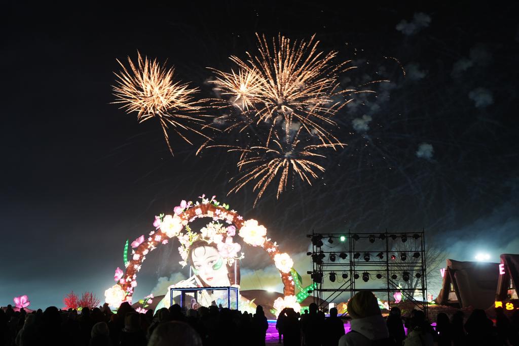 在沈阳市沈北新区的稻梦小镇拍摄的烟火表演。新华社记者 李钢 摄