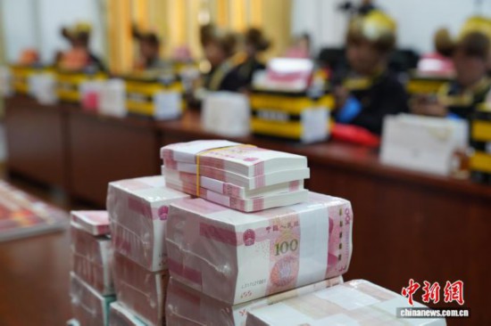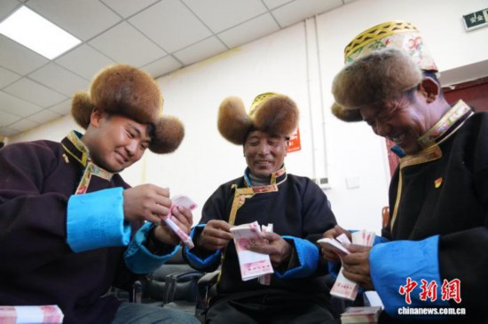 图为在分红现场,村民数钱。曲杰 摄