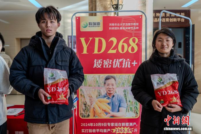 1月6日,河南农业大学农学院第九届弘农科技文化节现场,该校科研团队培育的突破性玉米新品种YD268成为焦点。众多学生排起长龙,踊跃领取样品,宛如一场“追星”活动。图为工作人员展示玉米新品种YD268。中新社记者 李超庆 摄