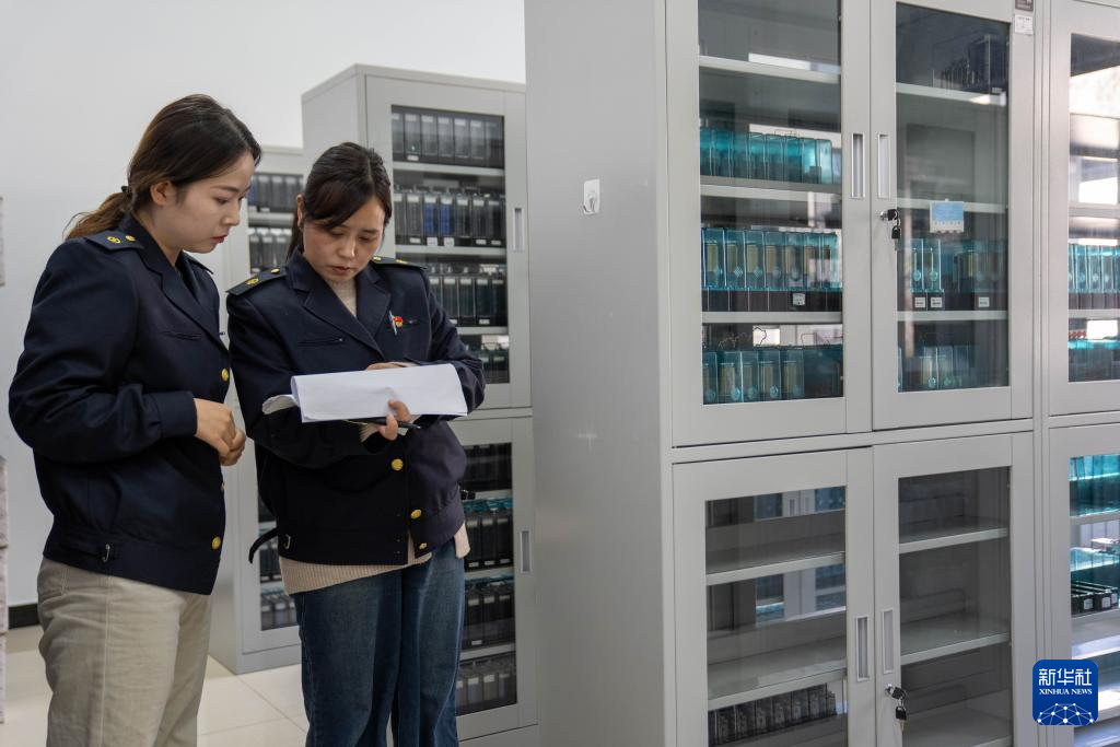 1月6日,拉萨基础设施段电务专修车间继电器检修工区的信号工路东燕(左)和德吉卓玛在检查继电器库房台账。