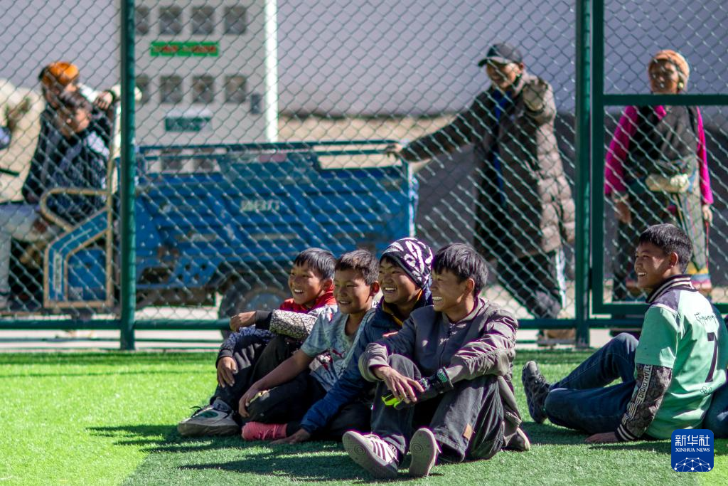 1月5日,在森嘎村的足球场上,少年在观看伙伴们踢球。
