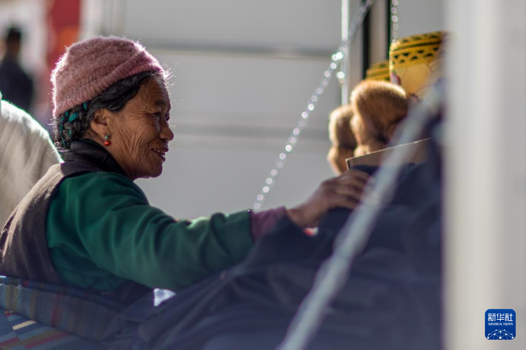 1月5日,在森嘎村村史馆前的广场上,老人晒着太阳吃着零食。