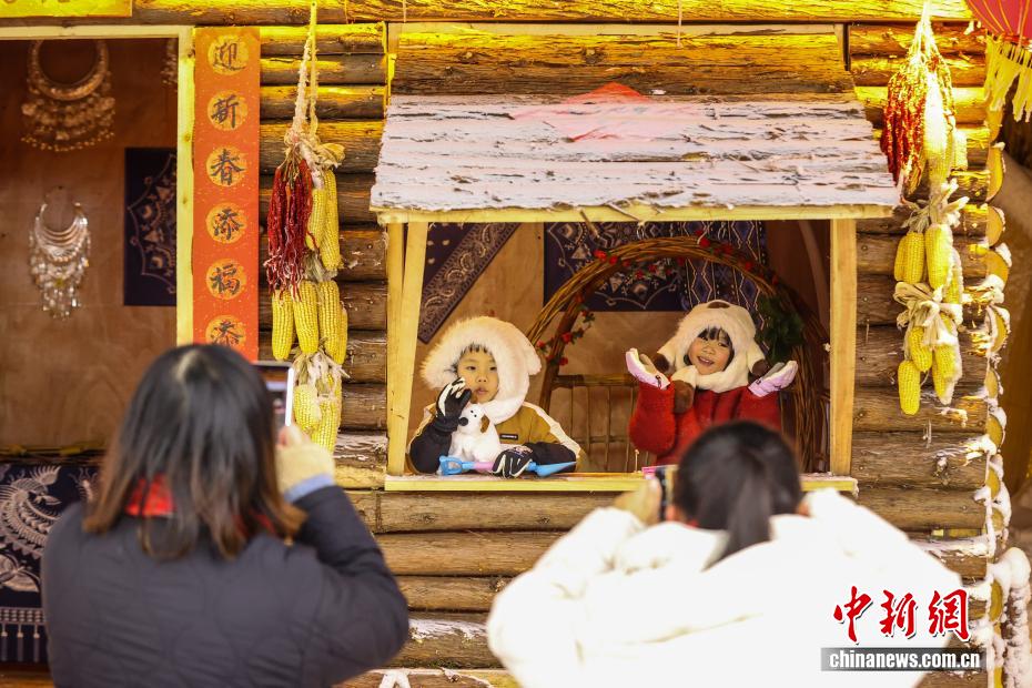 1月7日晚,游客在贵州省六盘水市钟山区“南国雪乡”项目内拍照。该项目由钟山区梅花山旅游景区凭借梅花山滑雪场的核心优势,以“厚雪压木屋、红灯映炊烟”为设计理念打造,旨在让南方游客无需北上即可邂逅地道雪乡风情,打造沉浸式文旅新体验。