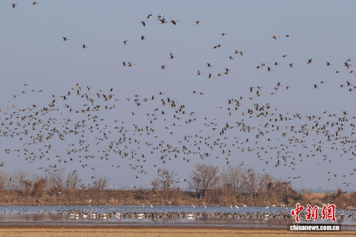 江西余干:鄱阳湖畔越冬候鸟翔集 群鸟共舞绘就生态画卷