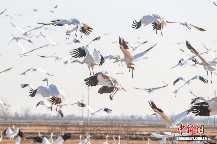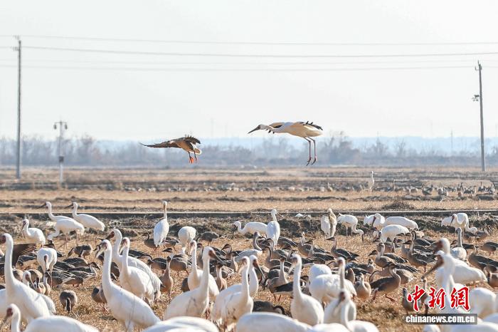 图为众多候鸟翔集于鄱阳湖畔的田野中。中新社记者 刘力鑫 摄